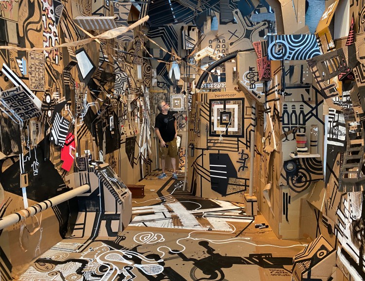 Mixed media drawings on cardboard, tape, acrylic, animated projection with original sound composition