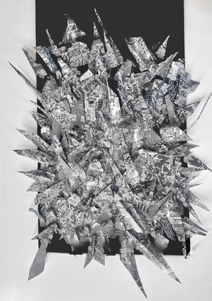 Dimensional paper sculpture of original grid drawings