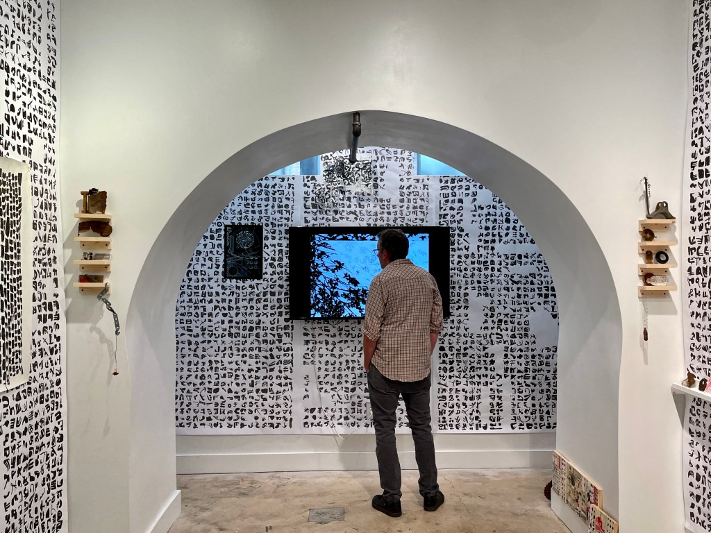Mixed media drawings, objects found on walks, custom pine shelving and furniture, video, sound composition