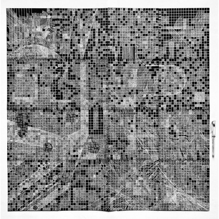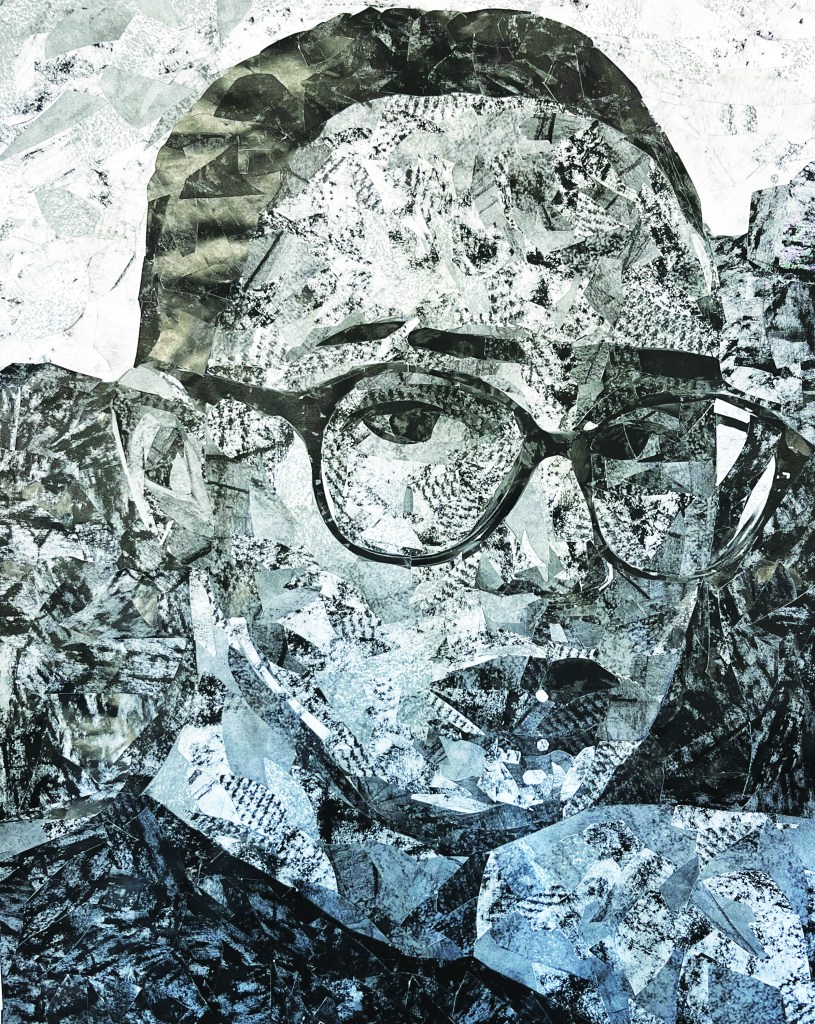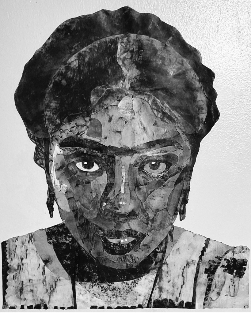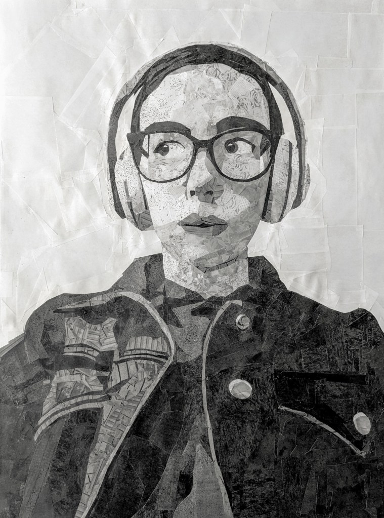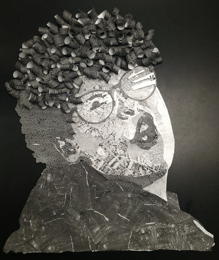 2-D Design students made charcoal and graphite rubbings from sites across campus. They scanned and digitally altered these in Photoshop to create a catalog of printed textures and values. Finally, they mapped, cut thousands of paper shapes, and constructed an analog 30” x 44” self-portrait collage. This was a scaffolded, 8-week project, 2024.