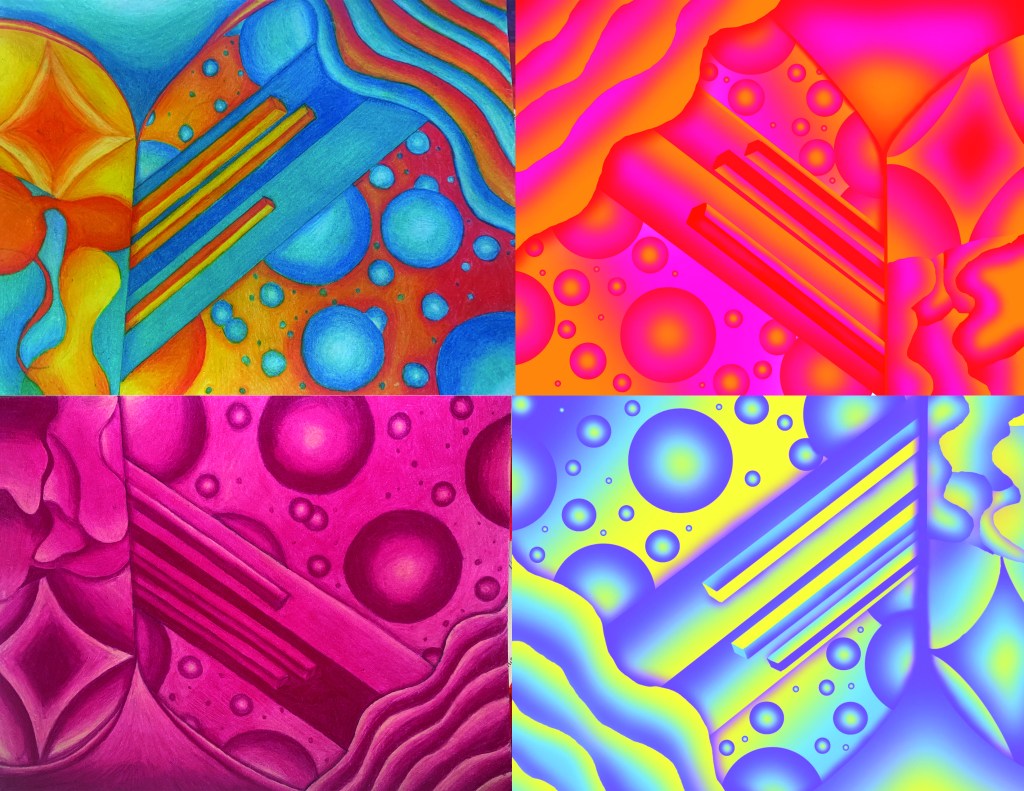 2-D Design. Sketchbook exercise 2: color harmonies 14″ x 10″, colored pencil and Procreate