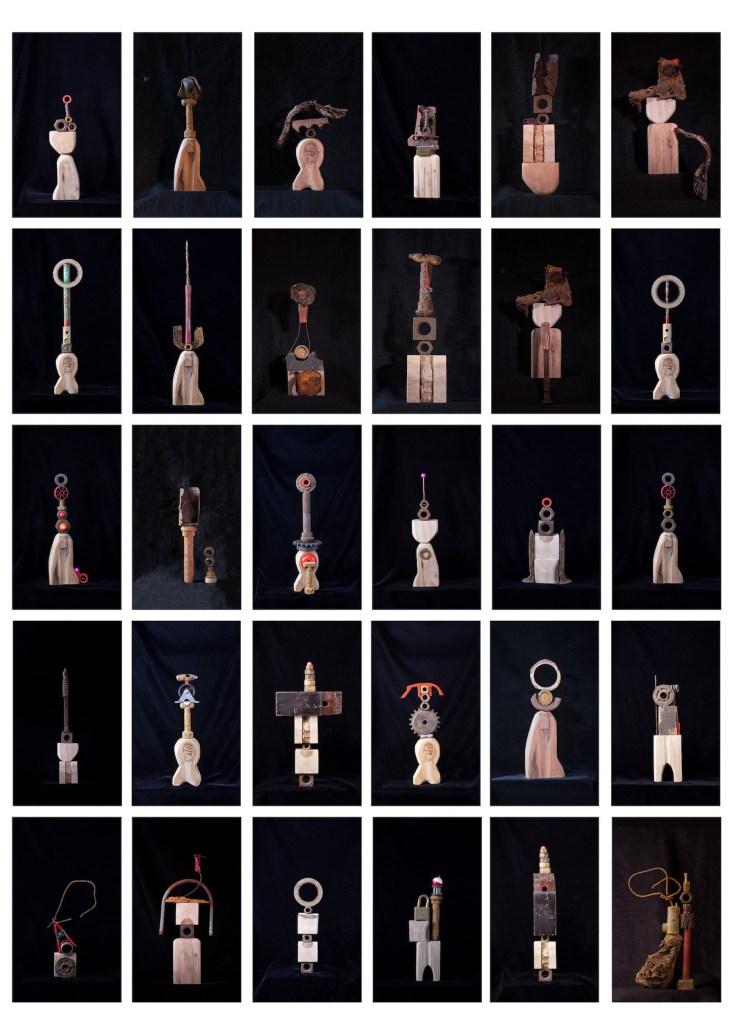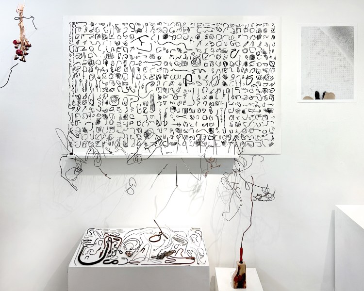 a section of a 42” x 66” India ink drawing of them, an icon made of pecan and found objects, an inkjet print of a digital photo, and preserved carnations