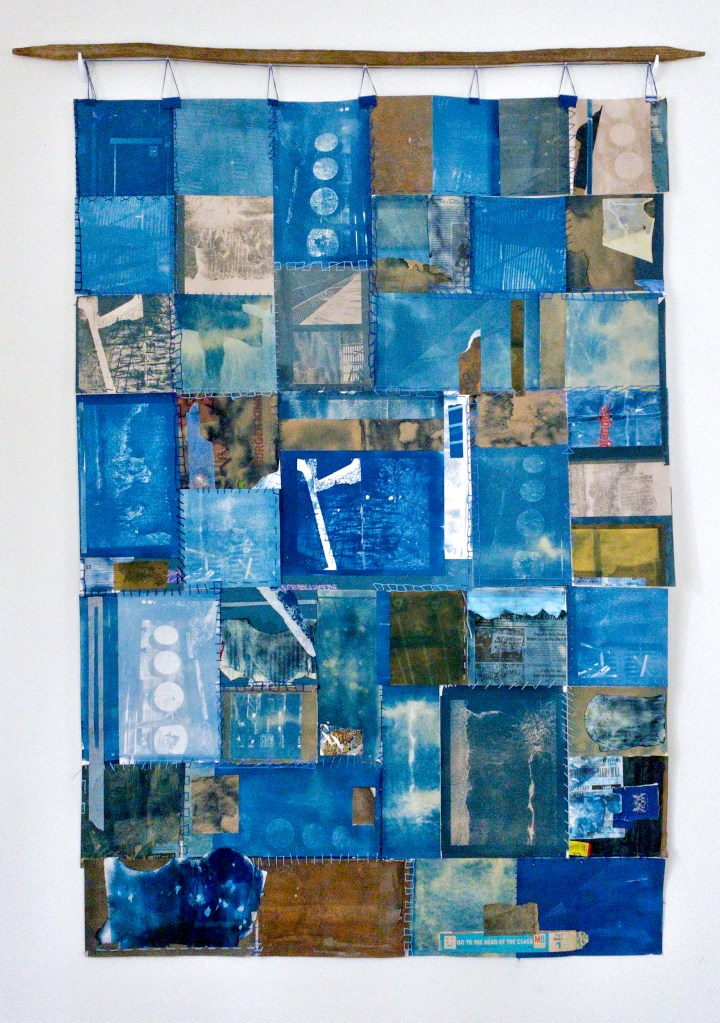 Cyanotype prints toned with coffee, tea, and black walnut ink, hand-stitched into a paper quilt, with found ephemera, embroidery thread, waxed linen, tobacco stick. 34″ x 60″
