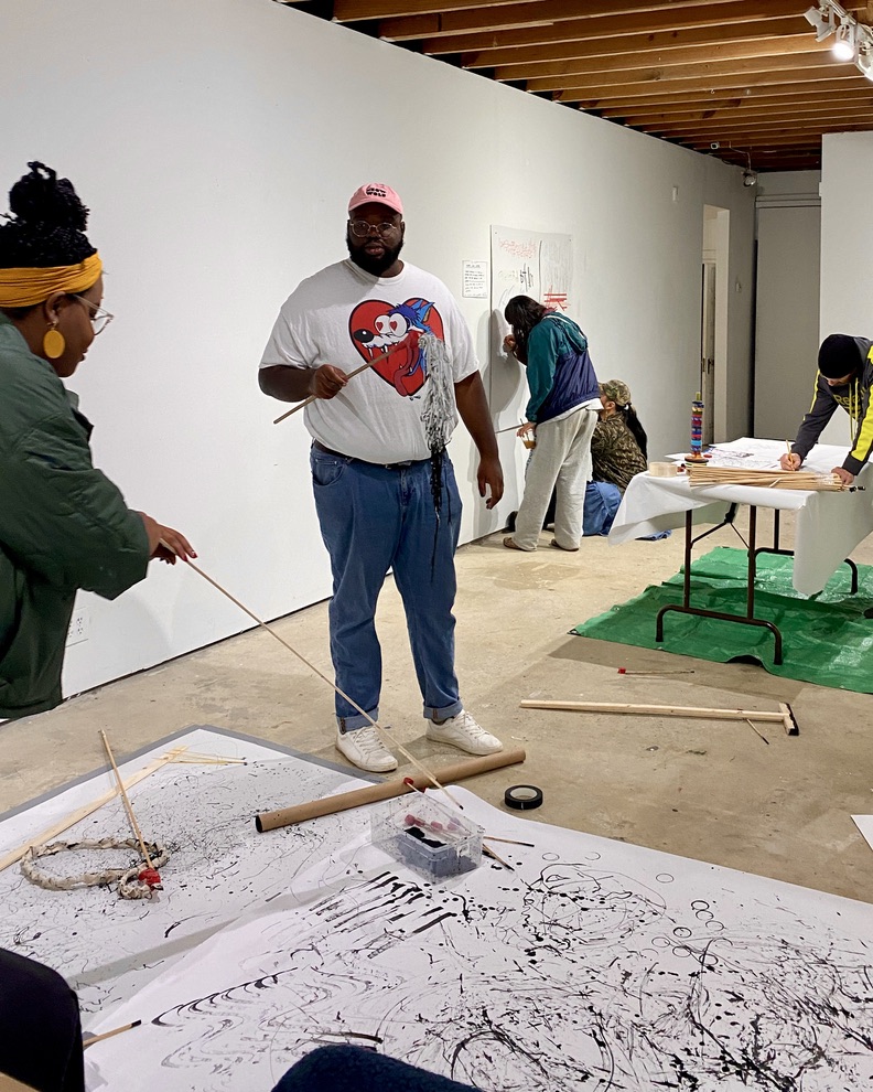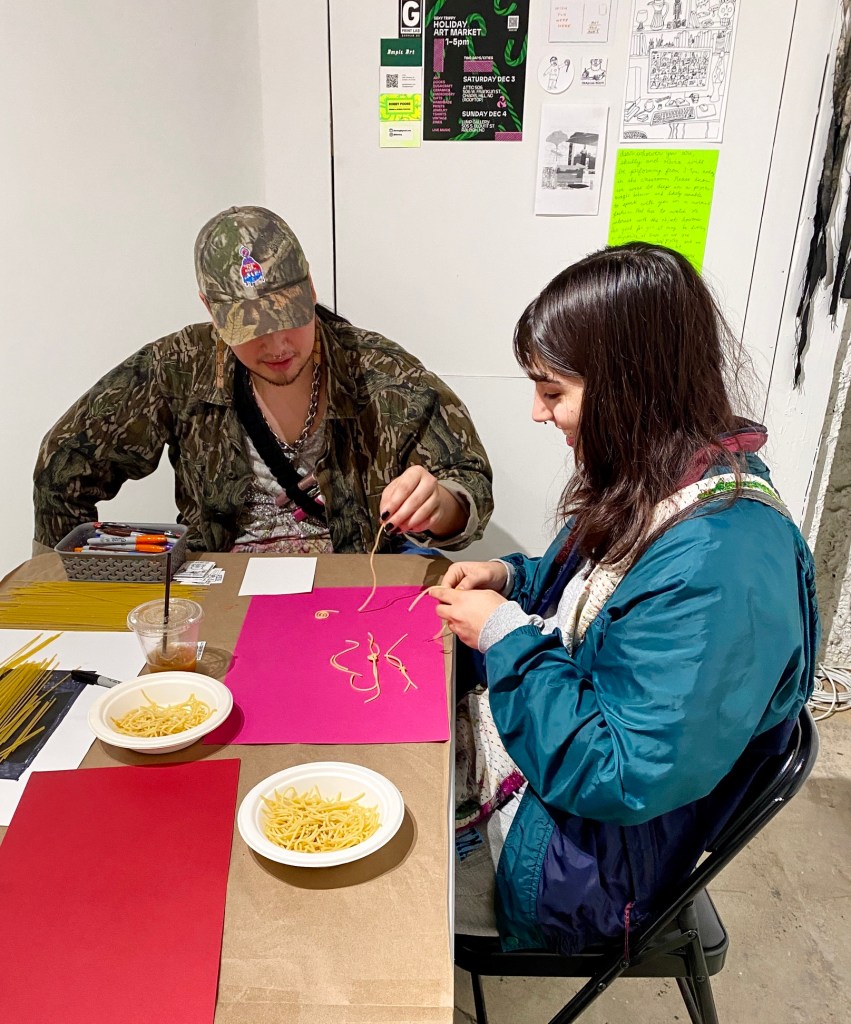Experimental mark-making and drawing workshop, Lump Gallery, 2022. Students experimented with improvised tools, drawing with cooked and uncooked spaghetti, asemic writing, tracing moving shadows, chance operations for determining drawings, exquisite corpse, and other collaborative drawing exercises.