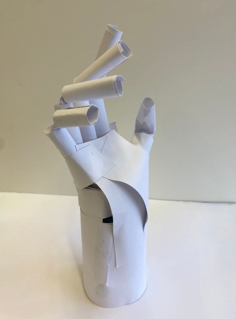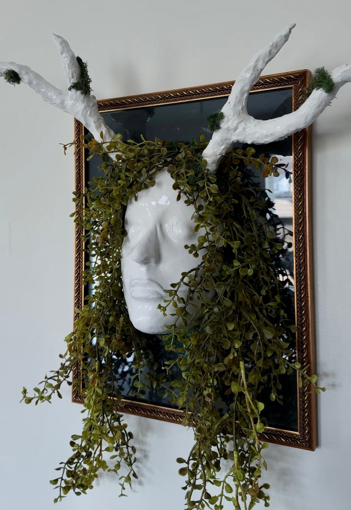 Paper hand, 11″ x 3″ x 4.5″ and self-portrait, plaster, resin, real and artificial plants, found mirror