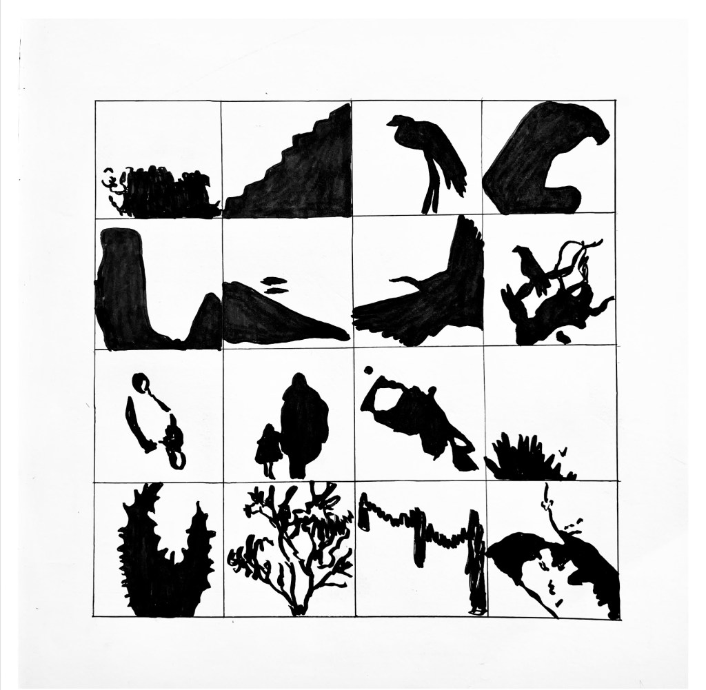 2-D Design. Sketchbook exercise 2. Develop an alphabet of shadow forms, 8″ x 8″, Sumi ink on paper